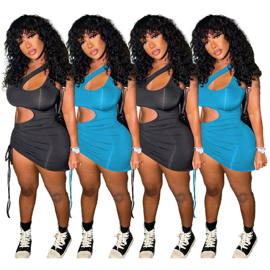 Solid Color Shoulder Sexy Waist Trimming Hip Dress