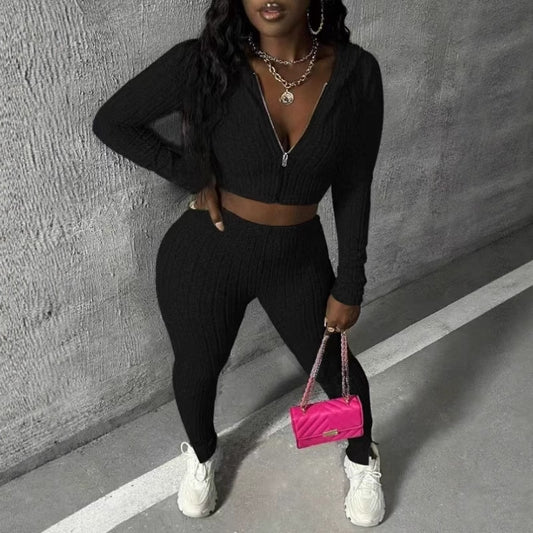 Casual Solid Color Knitted Long-sleeved Two-piece Set