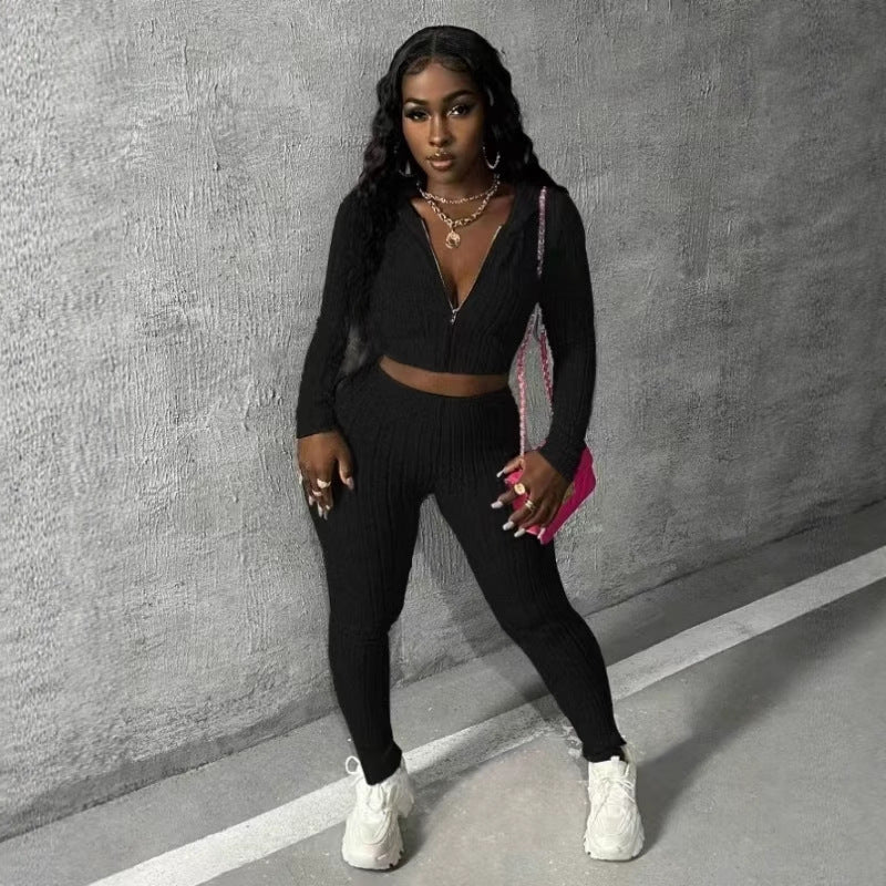 Casual Solid Color Knitted Long-sleeved Two-piece Set